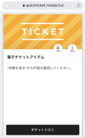 7.イベント当日、チケットを提示する [チケットを提示]をタップすると、提示画面が表示されます。この画面を、会場のスタッフにご提示ください。 |