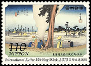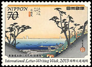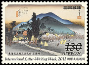 | International Letter Writing - Week issue is an annual series since 1958, with the aim of contributing to the world peace by encouraging cultural exchanges among people of the world through letter writing. This year's stamps depict four posting stations from The Fifty-Three Stations of the Tokaido by Utagawa Hiroshige that have never been selected for stamp design. |