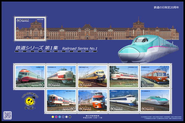 | This is the first issue of Japanese Railways Series with the theme of Japanese Railways and its related topics. The stamps were issued to commemorate National Train Day that was enacted to celebrate the first locomotive train raunning between Shinbashi and Yokohama in 1872. The stamps depict the Tokyo Marunouchi Station and Blue-Ribbon Award trains. |