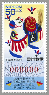| [N145] ¥50 New Year's semi postal stamp (selling price : ¥53) with lottery for 2014 depict Nogomi doll "Inarigoma", a folk toy of Saga prefecture in association with the year of the horse. "Inarigoma", first sold at the Yutokuinari shrine as a good luck charm, is a horse with a sacred gem on its back. |