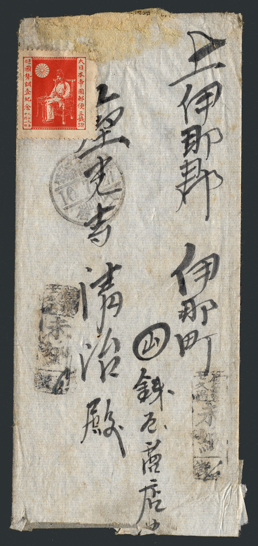 原則、日本国内だけしか切手が発行されず、外国郵便には使えませんでした。更に使用期間も限定され、1921(大正10)年3月31日で使用禁止となりました。それ以降に使用させた郵便物は、出品物のように「未納」扱いとなりました。ただし実際は見逃されて、「未納」印が押されなかった郵便物も多かったようです。