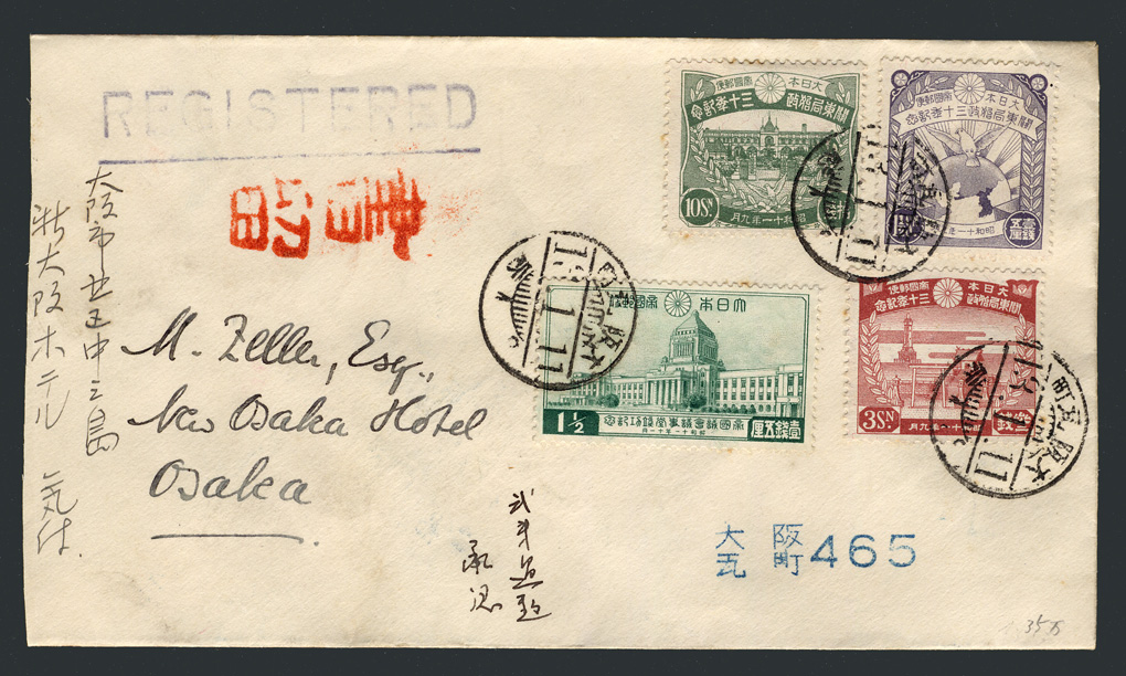 この郵便物には「2銭過超承認」と記入されています(超過の誤記?) 封書・書留は14銭ですが16銭貼られていますので2銭が「過納」となりますが、関東局始政30年3種を貼った段階で5厘オーバーしているのに、なお議事堂11/2銭を貼ったのかが疑問です。差出人が外国人ですので料金が分からなかったのかもしれません。