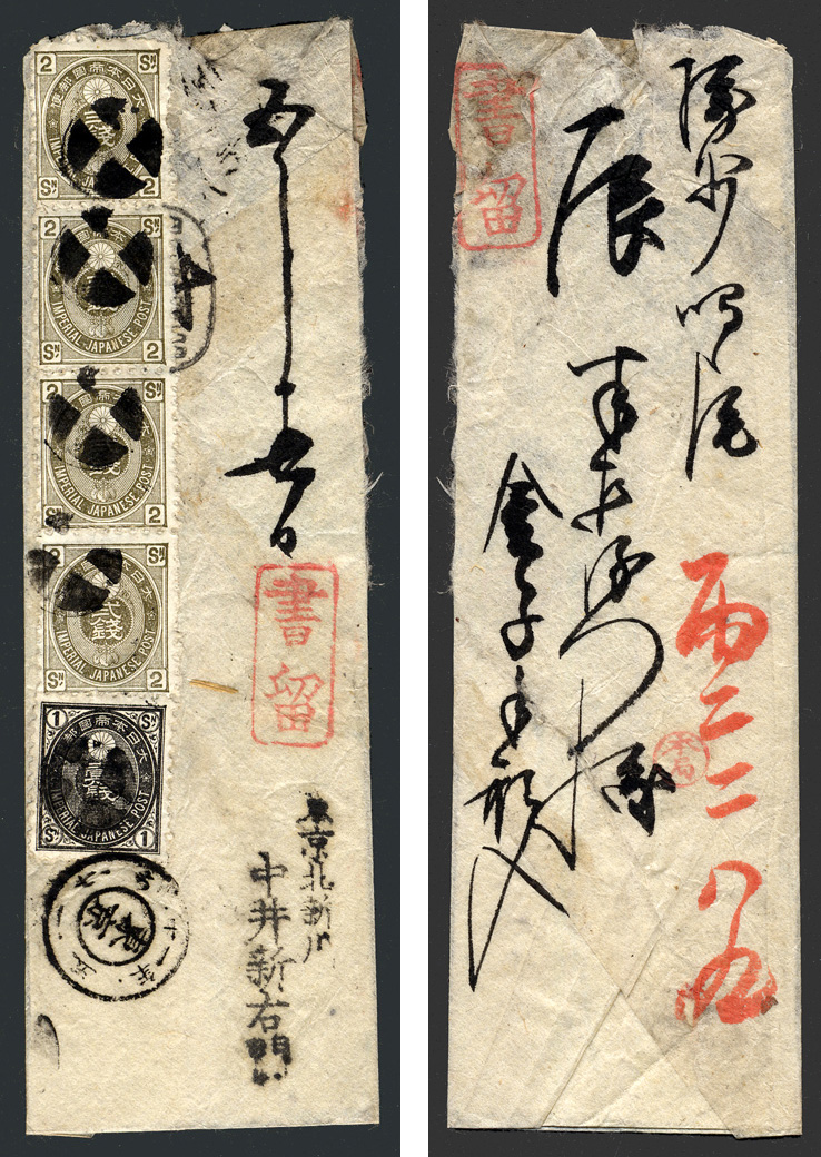 | Lot No.309 旧小判狸2銭縦4枚連、黒1銭貼、書留 白抜十字+東京N2B2(11年) |