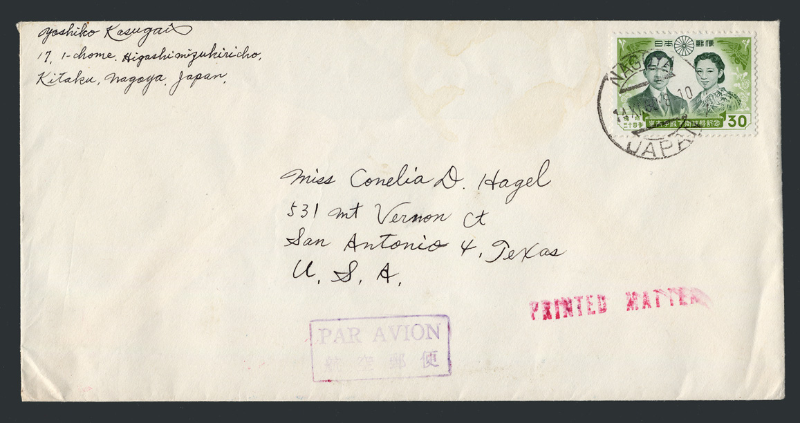 | 第2地帯(米国、カナダ、中米、西インド諸島)の航空印刷物30円料金の期間は、1959年4月1日〜1961年10月1日の2年半。この期間に発行された額面30円の記念切手は国際文通・桑名、蒲原、日米修好友好、それにこの皇太子成婚30円の4種類だけです。適応切手の少なさと、使用期間が比較的短いことから、昔から注目されている使用例です。 |