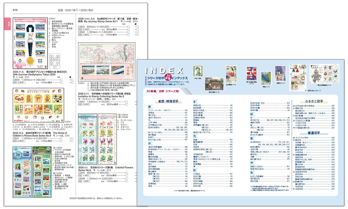 シリーズ切手が探しやすい、五十音順INDEX付き! 使いやすさにこだわった最新の「さくら」では、シリーズ切手を五十音順にまとめたインデックスを掲載。2025年の新切手はもちろん、新たに確認された外国製普通切手の銘版評価なども追録しています。