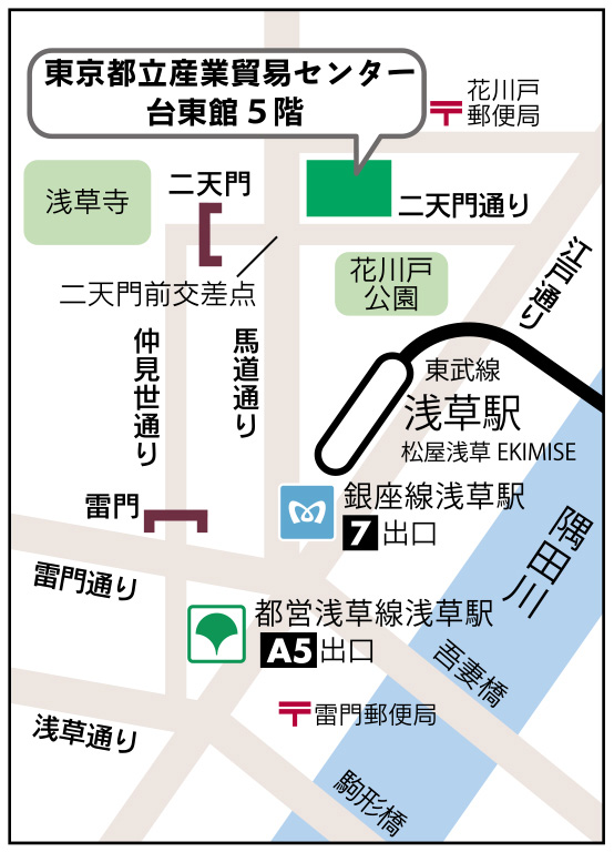 A1番出口へ。右側浅草寺方面に進み、5差路の中程「奥山おまいりまち」の鳥居をくぐり直進。浅草寺境内を通り抜け二天門から馬道通りを渡った正面。